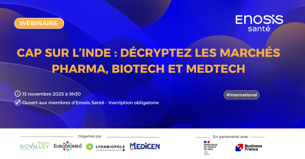 Enosis Santé, l’alliance française des pôles de compétitivité en santé (BioValley France, Eurobiomed, Lyonbiopôle Auvergne-Rhône-Alpes et Medicen Paris Région) organise un webinaire sur le marché indien à destination des entreprises Pharma, Biotech et MedTech, le 13 novembre à 9h30.